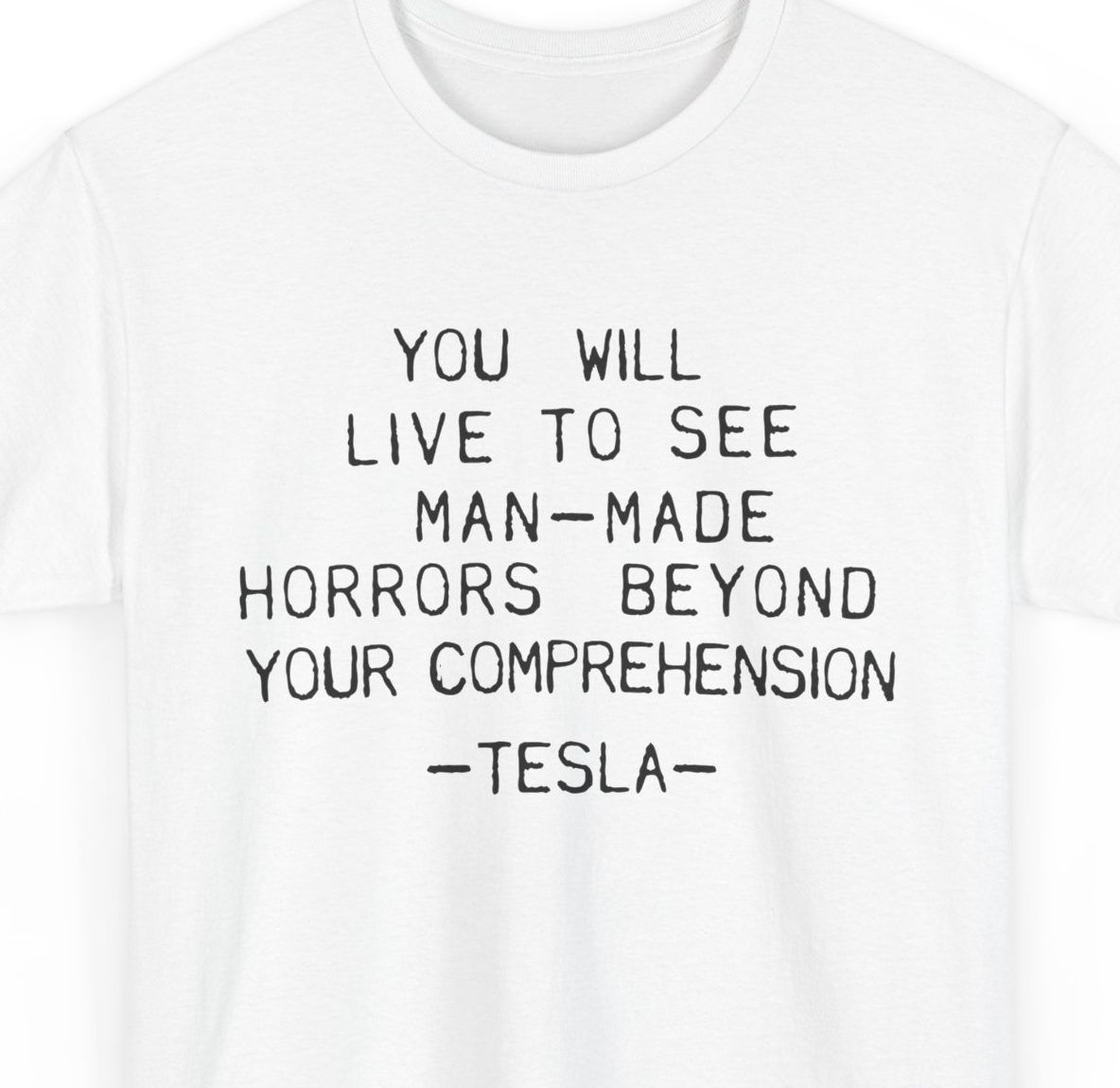 The quote “you may live to see man-made horrors beyond your comprehension” was said by Nikola Tesla in 1898 in response to a general seeing the potential for his inventions for warfare. In modern times it has picked up additional meanings.